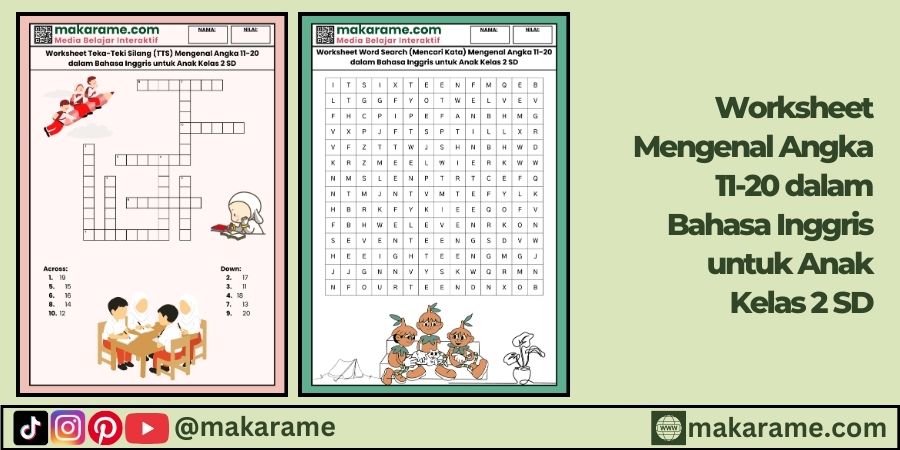 Worksheet Mengenal Angka 11-20 dalam Bahasa Inggris untuk Anak Kelas 2 SD terdiri dari 3 jenis latihan soal. Yaitu, teka-teki silang, puzzle word search atau pencarian kata, dan matching game atau mencocokkan angka dan tulisannya. File PDF dapat didownload melalui link berikut: