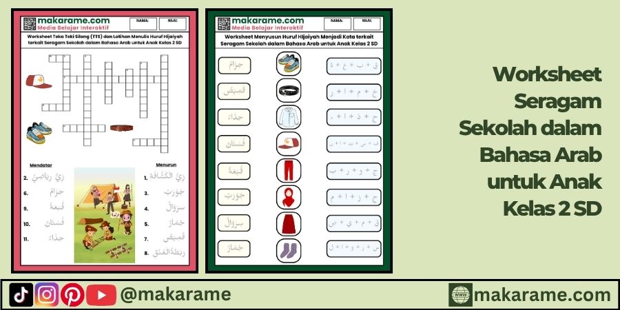 Worksheet Kosakata Seragam Sekolah dalam Bahasa Arab untuk Anak Kelas 2 SD terdiri dari 3 jenis latihan soal. Yaitu, teka-teki silang, matching word kata tunjuk, dan matching game susunan huruf hijaiyah dengan gambar. File PDF dapat didownload melalui link berikut: