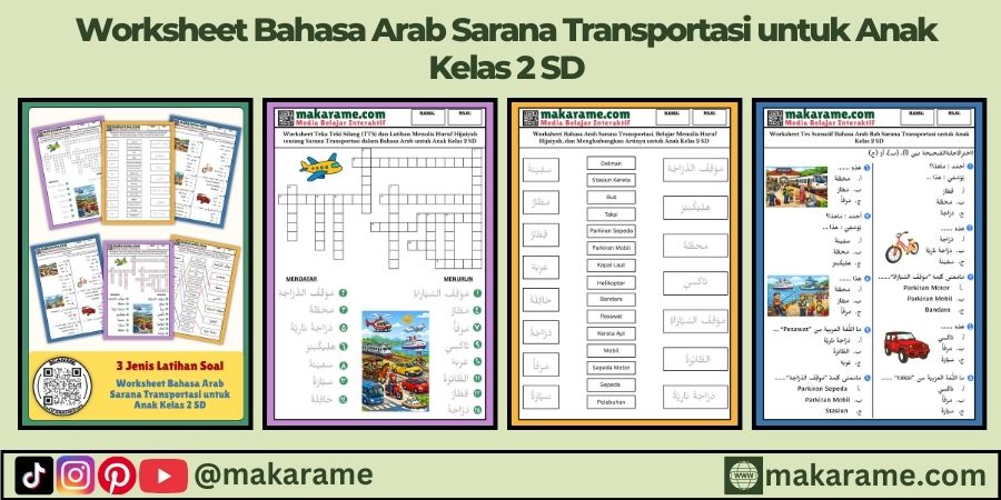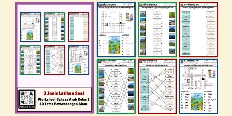 Worksheet Bahasa Arab Kelas 2 SD Tema Pemandangan Alam berisi latihan belajar kosakata Bahasa Arab tentang berbagai pemandangan alam yang dekat dengan kehidupan anak, seperti gunung, sungai, laut, sawah, dan hutan. Disusun dengan aktivitas sederhana, menarik, dan ramah anak untuk membantu siswa mengenal mufradat Bahasa Arab sambil belajar membaca, mencocokkan, menulis, dan memahami arti kata dengan lebih menyenangkan.
